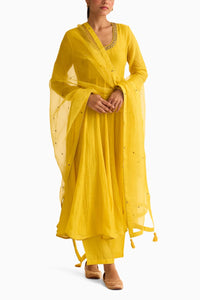 Chanderi kurta carries grace in its luxurious gheras and myriad kalis , stitched keenly together paired with soft cotton silk pants. The organza dupatta adds a texture of grace and makes it a formal ensemble.