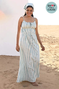 Our Varkala Dress is designed using striped cotton fabric. It features adjustable shoulder straps, keyhole neckline and cinched upper waist with a drawstring fastening, and a soft mulmul inner lining for a breezy summer look.