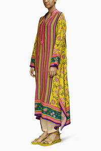 Gulaabo’ an unsung mystery, a secret bloomed in the baghs. Inspired by the morning dew of spring, a fresh whisper of greens, and the blushing beauty of gulaabi gajra. A colorful panel placement set featuring stripes and floral motifs, this Veena Kurta Set will make a statement for festive and special occasions.