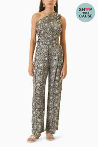 Featuring the Vellore Off-Shoulder Top and Chail Pants ensemble. The top, crafted from hand-block printed satin, showcases an off-shoulder design with drawstrings for adjustment and a concealed zip. Paired with Chail Pants, which feature a relaxed straight fit in the same satin fabric, with an elasticated back waist, front button closure, concealed zip, and practical side pockets. This set in Vellore color offers both elegance and comfort for versatile styling.
