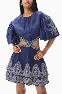 The Venessa Dark Blue Chambray Dress features a dark-colored chambray fabric with a waist cutout and delicate thread embroidery. Its two-tiered design adds a playful touch, making this dress a chic and flattering choice for casual or semi-formal occasions.