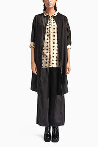 Regular fit front open button down mandarin collar long shirt-overlay Constructed in solid 100% cotton satin fabric with cotton silk lustrous sleeves layered with our urbane shirt featuring bold contrast beige base against crimson hand block printed motifs. paired with with our complimenting dyed solid comfort fit elasticated trouser finished with intriguing button cross details crafted by hand delicately .