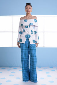 Featuring Vera Polka Dot Top with Plaid Pants by Mero's DOT collection. This striking co-ord set in banana crepe features an off-shoulder polka dot blazer paired with tailored checkered pants. A bold fusion of patterns and silhouettes for statement-making style.