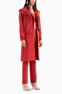 The Vermillion Bomber Trench Set, crafted from luxurious rayon crepe in bold red, combines the casual appeal of a bomber jacket with the sophistication of a trench coat. This striking ensemble offers a modern, versatile look with a fiery, fashion-forward edge.