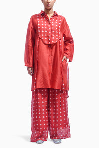 A hand block–printed co-ord set crafted in soft cotton silk, featuring our signature mud-resist print. The relaxed shirt with a detachable yoke pairs seamlessly with fluid printed pants, balancing structure and ease. Each piece is finished with our signature handwork of button and cross with golden zari, celebrating the artistry of handcraft in a modern silhouette.