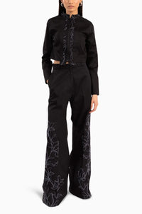 Drawing inspiration from the bomber jacket, this cropped jacket showcases a refined mandarin collar and elegant straight sleeves. The extended front panels and molded tooth zip closure enhances the jackets edgy look.