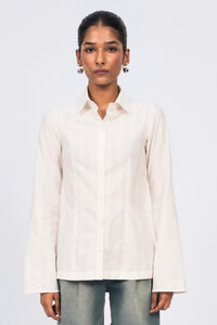 This slim-fit shirt brings a contemporary edge to a classic staple. Featuring a regular collar and clean front button closure, it’s designed with full sleeves finished without cuffs for a minimalist touch. Front and back darts sculpt a flattering silhouette, while vertical stripes elongate the frame for a crisp, polished look.