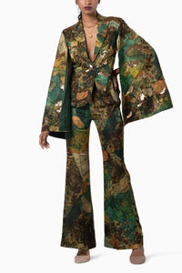 A fitted blazer with exaggerated cape sleeves, detailed with hand embroidered gold sequins, ideal for an elevated festive look. It comes with matching flared trousers, both made from fabric with gold Zari thread for a subtle sheen.