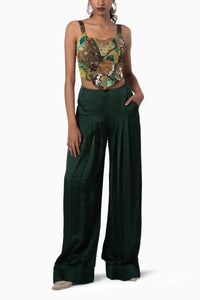 A hand embroidered V cut corset, structured with boning and an adjustable back cord tie up paired with deep green pleated super wide leg trousers. The fabric of the corset has a subtle sheen as It is interwoven with gold sari thread.