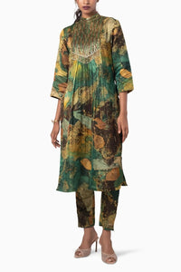 A high neck kurta with a hand embroidered yoke, paired with a slim fit trouser of the same print.