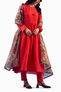 The kurta set is thoughtfully layered with a cotton silk slip, adorned with embroidered organza silk at the hem, adding a touch of intricate beauty. The entire garment is finished with decorative seams and contrast hemming, elevating its overall allure with a modern twist.