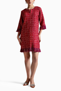 This red tweed dress is the epitome of seasonal elegance. Featuring chic 3/4 sleeves, it's a timeless staple that effortlessly combines style and sophistication. Complete the look by pairing it with your favorite heels for a touch of glamour that's perfect for any occasion.