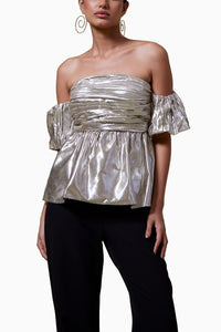 The Vico top is a fitted bandeau style top with attached sleeves on the side. It has hand draped detailing and a frill that comes out from the waisted cutline. It's made in a silver/gold metallic and is zipped at the back. The Vico top is available in a range of colours: Fuchsia pink, green, orange and purple.