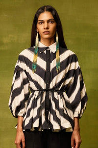 A contemporary take on a classic shirt, featuring a bold hand-drawn diagonal print. Designed with a pointed collar, button-down front, and voluminous sleeves with elasticated cuffs. The adjustable drawstring waist cinches the silhouette, allowing you to style it fitted or relaxed for versatile wear.