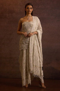 Featuring Viha Ivory Off-Shoulder Short Kurta Set by The House of Exotique's Nagma Collection. The off-shoulder kurta with a tube neck is fully embellished and features a center back zipper fastening. The front-belted salwar with an elasticated back offers an easy fit, with embroidery at the bottom. The dupatta is fully embroidered on Chantilly lace, with hanging tassels on both sides, crafted from Chantilly lace and Habutai silk in a soft ivory hue.