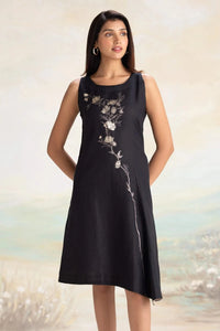 Featuring the Vine Line Celine Dress in 100% linen, this versatile round neck dress boasts a high-low asymmetric hem. Hand screen-printed with delicate floral vines and metallic accents, it blends natural elegance with modern flair for a comfortable, standout look.