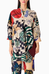 Featuring the Vintage Block Akira Kurta by Saaksha & Kinni's Nirah Collection. This tunic showcases an abstract floral and checkered print with an asymmetric collar, offering a contemporary twist on classic elegance. Perfect for effortless yet statement-making style.