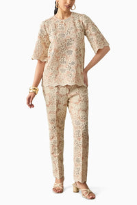 A sophisticated nude-pink co-ord set featuring intricate white lace overlay. The semi-sheer top with elbow-length sleeves pairs beautifully with matching tapered pants, creating a timeless and elegant ensemble perfect for special occasions