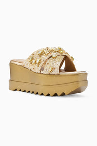 Our Vintage Vanity wedge sandals are crafted in ornate shimmery brocade fabric and adorned with opulent drop-shaped jadau pieces. Smaller pieces of similar style are embroidered across the cross strap and highlighted with mini silver stones.