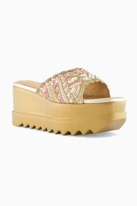 A Whiff of Nostalgia, A Touch of Glamour. Like a secret passed down through generations, Vintage Wink holds an old-world charm wrapped in modern elegance. Soft pearls, shimmering sequins, and delicate cutdana embroidery dance across a golden canvas, capturing whispers of vintage romance.Ethereal yet bold, these sandals are for the ones who find poetry in nostalgia and beauty in every little detail.The artisans of Anaar take 20 hours to carefully construct this pair.