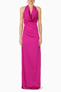 Turn heads in the elegant Viola Gown, a timeless piece that exudes sophistication. Crafted from a luxurious, silky-smooth satin fabric in a rich red hue, this dress features a chic halter neckline with a cowl drape for a soft, alluring effect. The back is designed with a dramatic tie-up detail that cascades down, while the figure-skimming silhouette drapes beautifully to the floor. It's a perfect choice for your next formal event.
