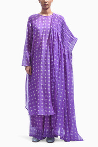 A statement ensemble in hand block printed silk, featuring a flowing kurta and coordinated pants with soft lining for comfort. Paired with a matching dupatta, detailed with delicate smocking work, this set combines traditional craft with a contemporary silhouette.
