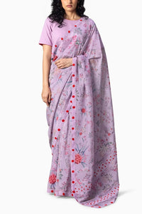 Virelia Saree, adorned with a lavender chanderi border enriched with red towel embroidery, featuring pleated textures and embroidered panels on the pallu.