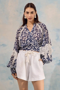 This wrap top features an abstract Ikat-inspired print, a relaxed fit with a gathered waist, and long bishop sleeves with lace inserts. Smocked cuffs, a V-neckline, and a back tie-up detail complete its effortlessly chic look.