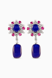A captivating fusion of color and elegance, the Vittoria Tumbler Drops bring together rich hues and refined craftsmanship. The deep blue tumbler drop creates a striking foundation, while the intricate circular top motif adds dimension with its blue cabochon center, a shimmering halo of diamonds, and a bold outer ring of red cabochons. Designed to make an impact without being overpowering, these earrings offer a perfect balance of vintage allure and modern sophistication.
