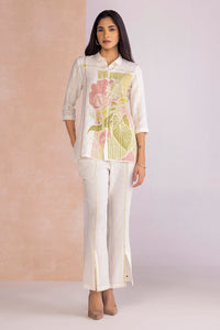 Vivid Dreams Shirt Co-ord Set is crafted in a breathable linen blend, featuring a relaxed shirt with 3/4 sleeves, side slits, and contrast overlock detailing, paired with panelled boot-cut pants with a sleek front slit. Designed for comfort, modern structure, and versatile styling.