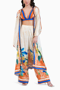 Vivid Floral Printed Cape, Pants And Bustier With Scallop Neckline