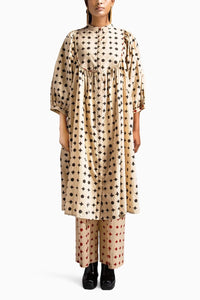 Voyage Set is crafted in the finest cotton, hand block printed by our artisans in Bagru featuring our original print pattern . The mandarin collar neckline, hidden button placket and ruffled sleeves adding a vivd character.Finished with our signature handwork in golden thread detail carefully placed on the dress to amuse the wearer.Intriguingly paired with our block printed opaque relaxed fit trouser in contrasting color in matching print finished with signature button cross details.