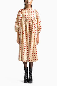 Voyage Midi Dress is crafted in the finest cotton, handblock printed by our artisans in Bagru featuring our original print. The mandarin collar neckline, hidden button placket, and ruffled sleeves add a calm vivd character. The dress carries with it a forever playful swirl with rhythmic printed pattern all over the dress. Finished with our signature handwork in golden thread detail carefully placed on the dress to amuse the wearer.