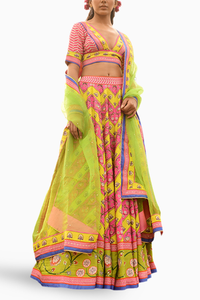Gulaabo’ an unsung mystery, a secret bloomed in the baghs. Inspired by the morning dew of spring, a fresh whisper of greens, and the blushing beauty of gulaabi gajra. Embrace the delicate details of embroideries over traditional prints in this surreal lehenga set. With the color palette, this set is a must-have for women for the wedding season!