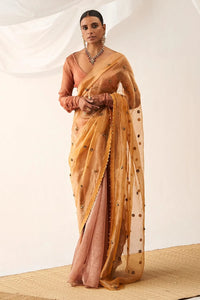 Featuring Vritra Peach Saree Set by ITRH's Sona Chandi Collection, this Set includes a churi sleeves knot top paired with a regular saree. The peach silk tissue palla is intricately adorned with ghunghroo work, adding a touch of elegance and tradition to the ensemble.