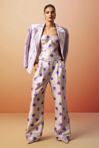 Featuring the Vyani Printed Blazer and Corset with Trousers by Mero's The DOT Light Collection. This sophisticated set in beige and purple printed raw silk includes a tailored blazer, structured corset, and matching trousers, perfect for a chic, modern statement.