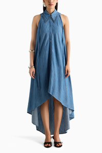 Featuring the Washed Denim High Low Dress by MellowDrama's Utopia Collection. Crafted from 100% cotton washed lightweight slub denim, this sleeveless shirt dress showcases a front opening with buttons, a crystal droplet embellished collar, tie detail at the shoulder, and a relaxed fit for casual elegance and comfort.