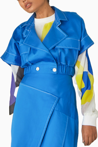 Featuring short Cotton collared jacket with patch pockets. The Bright blue is complimented with a white topstitch detail. The waist is elasticised and the front has an overlap with button fastening.