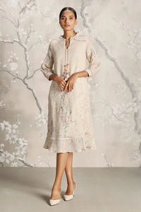 We venture into the forest on luxurious linen and between the thickets, we witness exuberant blooms that are hand screen printed; accompanied by the sensuality of delicate lace and paired with the embroidered harmony of Hakoba fabric to let you commune with Mother Nature in style.