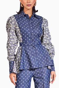 Featuring the Wardrobe Essential Denim Top from House of Zeniaa's Rodeo Blue Collection. This modish top in color block denim features printed panels for a cute touch. With a front button opening, peplum, and cinched waist, it's paired perfectly with straight denim pants.