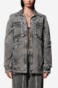 Featuring Washed Black Denim Jacket by Mellow Drama from their A/W'24 Collection - Catalyst. Elevate your denim style with this oversized washed quilted jacket. Crafted from 100% Cotton denim, it boasts a double collar detail, front pockets, front openings with statement logo buttons, and contrast stitch embroidery with raw edge detail. Redefine casual chic with this bold and stylish piece.