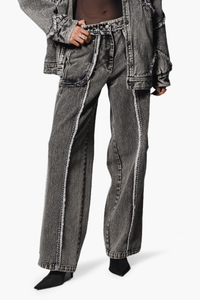 Featuring Washed Black Denim Pants by Mellow Drama from their A/W'24 Collection - Catalyst. Elevate your denim game with these washed wide-leg, mid-waist pants. Crafted from 100% Cotton denim, they feature utility pockets, dart details, a front opening with zipper and statement logo button, and contrast stitch embroidery with raw edge detail. Redefine casual chic with this versatile and stylish piece.