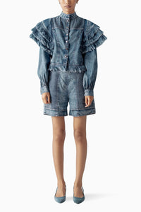 Featuring Washed Denim Pintuck Shirt, a stylish addition to your wardrobe. Crafted from 100% lightweight cotton denim, this shirt features washed denim with pintucks, asymmetric frills with fringes on the sleeves, a shoulder yoke with pintucks, and a front opening with monogram-embossed buttons. Complete with full sleeves, cuffs, and a button, all in a comfortable regular fit.