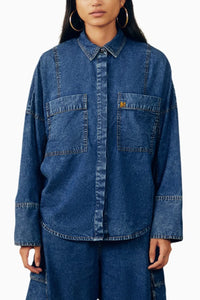 A wardrobe must have, this shirt is made from lightweight cotton denim into a classic silhouette that's slightly oversized. It is stitched with contrasting ochre thread which gives it an edgy look.