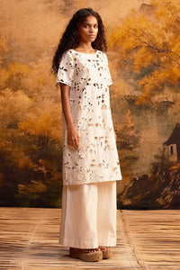 The Washi Shift Dress is one with a straight-cut, anepitome of casual summer elegance. Designed with aboat neckline and intricate cutwork embroidery, itbalances comfort and sophistication, making it theideal choice for a relaxed, stylish weekend look.