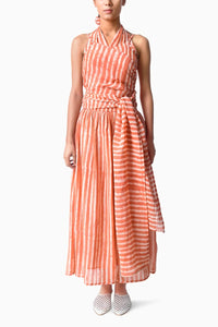 Bold yet graceful, the Waspie Coral Co-ord Set features a matching cami wrap and bralette, paired with a comfortable elasticated skirt. Crafted in coral red Dabu hand-block printed Chanderi silk, printed in Bagru near Jaipur, it blends artisanal tradition with contemporary style.
