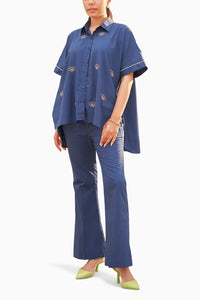 Embrace timeless elegance with our Blue Kaftan Shirt, featuring intricate bead and thread embroidery. The mesmerizing evil eye motifs, combined with a striking heart design, add a contemporary edge to classic style. Perfectly paired with flared pants, this kaftan offers a blend of cultural charm and modern flair.