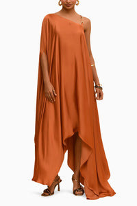 This elegant full-length dress features a solid design with a flattering one-side shoulder cut and unique cowl details. The asymmetrical hem adds a touch of modern sophistication, while the metal details on the straps provide a stylish edge. Perfect for a chic, standout look.