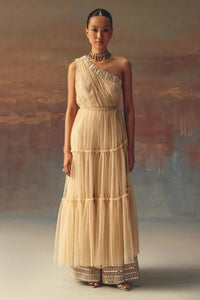 Featuring a one-shoulder layered Anarkali dress, beautifully embellished with mirrorwork and delicate beadwork for a look that exudes elegance and charm. Paired with net palazzos adorned with matching mirrorwork, this ensemble is perfect for festive celebrations and statement occasions.