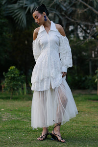 Featuring the Wavelet Lace Flowy Dress by Trisara's Fuss Over Me Collection. This white lace fabric set with net layers features a fitted waist and flowy layers, offering a delicate, feminine silhouette with ethereal movement and intricate detailing.